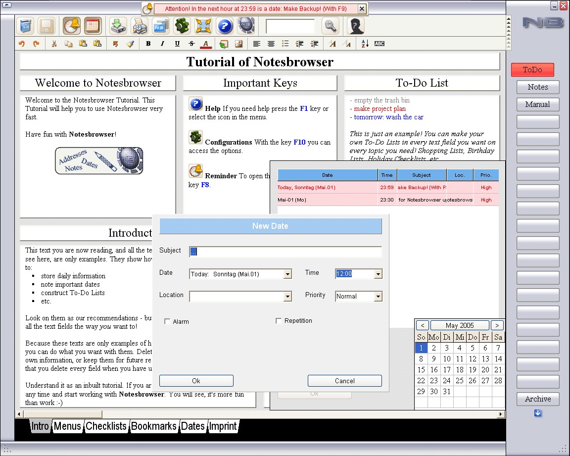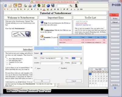 Notesbrowser is a helpful, fast-access systems tray Freeform Organizer for making and storing quick notes and organizing dates. The tool has a calendar and many fields, where you can store, for example, to-do-lists, dates, bookmarks or your mp3-playlists. A integrated search function allows it to find your entries. Notesbrowser can remind you to dates. A number of cool skins are available, to change the surface the way you prefer. All in all, Notesbrowser offers you an easy way to enter and manage your dates, addresses and notes at one place. Notesbrowser has been downloaded over 750,000 times now! Fool-proof installation within 15 seconds! Small learning curve: Comes along with a tutorial! It's that simple that you will understand it in five minutes! Many languages are supported, English, French, German, Spanish, Italian, Dutch Portuguiese, Slovak, Russian... The setup is both, Freeware and Shareware. you can choose at the first start if you want to try the Shareware for 60 days. After that, you can either switch to the Freeware or buy Notesbrowser. |