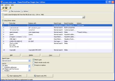 Search and Replace multiple Microsoft PowerPoint presentations. Change hyperlinks and UNC paths when servers get renamed; update contact details such as names, addresses and phone numbers; translate presentations with find/replace lists; update Microsoft SharePoint documents or Microsoft Namespace Server mappings. Using PowerPointPipe is simple. 1) Drag and drop files from Windows Explorer to PowerPointPipe, or right-click the files or folders to process in Windows Explorer and choose PowerPointPipe. 2) Add one or more search/replace pairs. 3) Go! PowerPointPipe can change thousands or millions of presentations, and can make multiple changes simultaneously to save time. It automatically handles read-only files, passwords and other protection, and it can be automated to run overnight or over a weekend. No user interaction is required. It even includes restart recovery in case Microsoft PowerPoint crashes! PowerPointPipe offers many more search and replace options than Microsoft PowerPoint; such as hyperlinks, text boxes, shapes, document properties (such as Title, Subject, Author, Company etc) and more. EasyPatterns and Perl regex patterns can also be used. Unlike competing products, PowerPointPipe is fully Unicode compliant (allowing Find and Replace with international character sets), and can handle an unlimited number of presentations and find/replace pairs. PowerPointPipe can also update ISO-9001 version numbers. PowerPointPipe can search/replace both .PPT and .PPTX PowerPoint document formats. Try it today - and see why Microsoft recommends PowerPointPipe to its customers! |