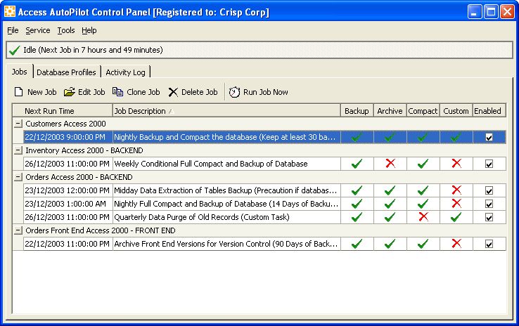 Access Autopilot will save you hours of time and frustration by ensuring critical backup, compact and archive operations are automatically scheduled overnight. But more than just an automated compact utility, it's a total access database 'back-end' administration control center. Need to compact the database or bring it down for maintenance?