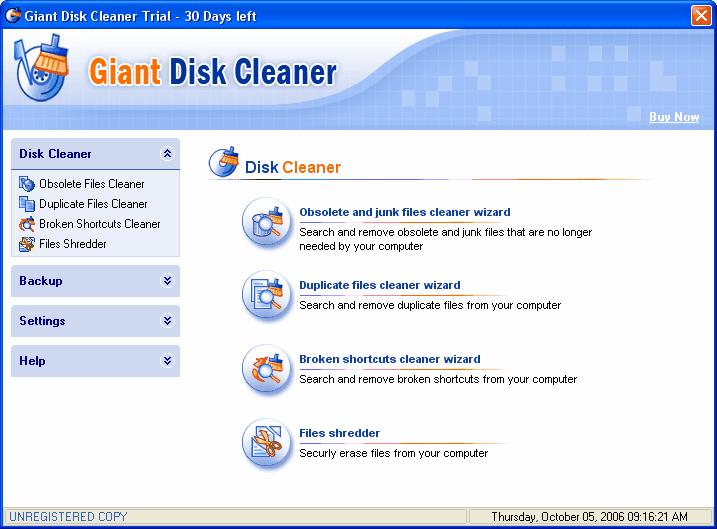 Giant Disk Cleaner securely clears obsolete/junk files, duplicate