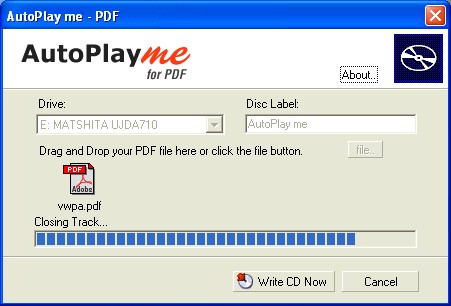 Simply drag and drop your PDF file and then press the Write CD Now button and you are done. AutoPlay me for PDF does all the work. Not only does it add your file it also adds the Foxit PDF Reader to the cd. Your PDF Document runs through this viewer so you now do not need to worry whether a PDF viewer is installed on the target computer. |