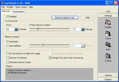 Cacheman is a utility designed to improve the performance of your computer by optimizing the disk cache, memory and a number of other settings. Cacheman is able to prevent frequent paging to the hard disk, resulting in improved performance, system reaction time and stability. Wizards and predefined profiles make it suitable for novices and yet it is also powerful and versatile enough for the more experienced user. Cacheman also corrects generic problems on systems with more than 512MB of RAM. What can I do with Cacheman? Optimize Disk Cache, Name & Path Cache, CdRom Cache and Icon Cache Periodically Recover memory back Watch & monitor several important system values - Overview page - History Graph - Logging Tweak several system settings to improve performance Use Tray Icon for monitoring Create System configuration reports |
