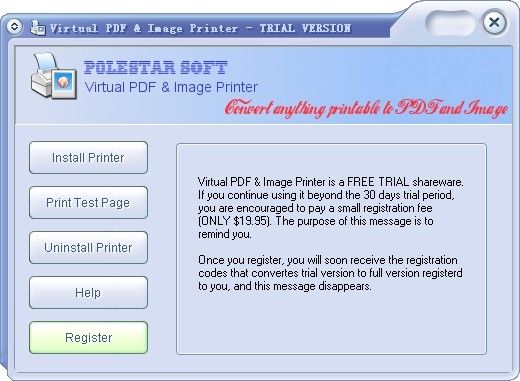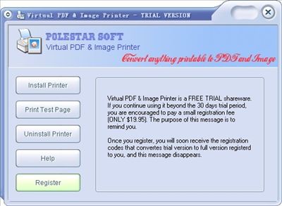 Polestar Virtual Printer is a combination of virtual PDF printer and virtual image printer, which enables you to convert Word, Excel, PowerPoint, PDF, AutoCAD, Photoshop and much more document types into PDF, TIFF, JPEG, GIF, PNG, BMP,or EMF