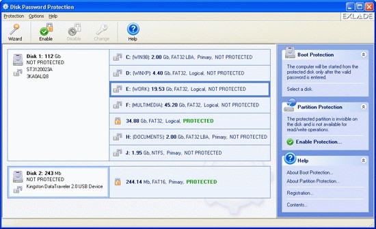 is a comprehensive suite of hard-drive protection/access restriction tools. Protect your disk/partitions with a password, ban all reading/writing activity, limit launch of specified files to authorized personnel only, etc. Disk Password Protection 4.8 offers users the option to choose what kind of protection they need. First is the Boot Protection. When chosen, any unauthorized person will not be able to boot a computer without entering the correct password. The program also offers Partition Protection. Any person can chose to have one or several partitions where all confidential information is stored. When protection is activated, the partition will be invisible to the operating system and the disk space taken up by sensitive data will appear as free disk space. The Low-Level Protection option allows users to blocks all attempts to read/write to/from the protected disk. The drive itself will appear as if it were just manufactured and is not formatted to perform any operations. This protection works only for ATA-compatible disks and must be activated in MS-DOS. |