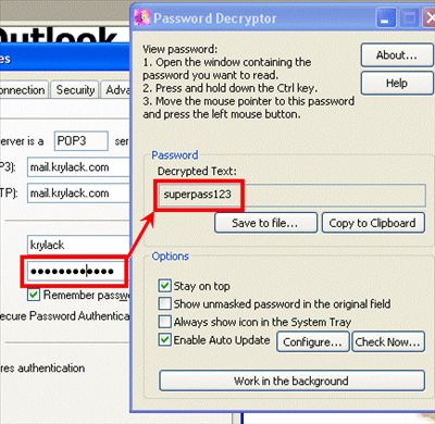 Windows stores your frequently used passwords, such as the passwords in Outlook Express email or for an FTP connection. But since you no longer enter the saved passwords manually, you often tend to forget them. The password is staring right at you, but it's hiding behind a row of asterisks. This feature is intended to protect your passwords; but sometimes this feature becomes more of a nuisance, rather than a benefit. KRyLack Password Decryptor is a program that lets you see the actual password behind the asterisks! It can recover passwords to programs such as Microsoft Outlook / Outlook Express, The BAT! and other e-mail clients, FTP clients such as CuteFTP, FlashFXP, etc. |