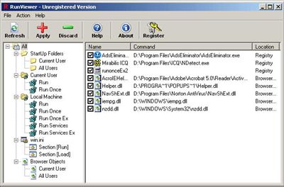 RunViewer helps you to find and disable spying programs and other software that you can't turn off without knowing right registry keys. If you has some sleazy web site taken over your browser, or getting pop up ads even when your browser has been closed for some time this can mean, that you was forcibly hijacked by malicious web sites. RunViewer