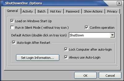 ShutDownOne runs in the system tray and allows you to quickly shut down Windows. You can choose from a full shutdown, reboot, log off, power off and also lock the work station, activate hibernate. Any operation can be executed as an emergency (force) shut down. In addition, you can perform scheduled shutdowns, no-activity action and more. ShutDownOne also allows you to perform remote shutdowns for machines on the network and supports commandline operation, as well as creation of batch files for any selected action. Additional features include custom commands before execution, optional user warning and password protection, auto-login after Restart, deleting a IE temporary files, typed URLs, cookies, IE history and more. |