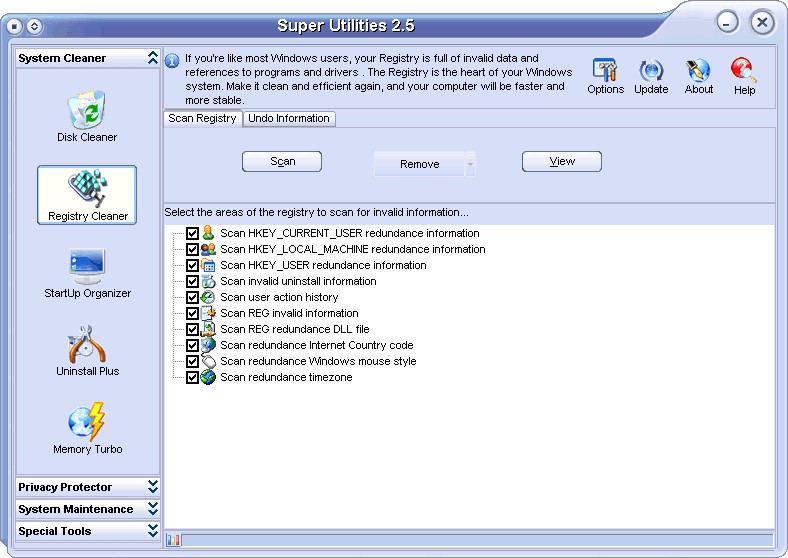 Super Utilities offers 26 tools for fixing, speeding up, maintaining, and protecting your PC. It encompasses four suites of utilities: System Cleaner, Privacy Protector, System Maintenance, and Special Utilities. System Cleaner features a spyware-removal component as well as tools for cleaning your disk and Registry, and for performing routine maintenance tasks. Privacy Protector assists in protecting and securing sensitive information. You can hide or lock folders, clean your system tracks, password-protect applications that hold sensitive data, quickly and securely delete files, and hide IE Favorites and Start menu items from view. System Maintenance will help automate computer maintenance jobs to keep it smooth, fast, and error free. It includes Task Manager-like functions, Internet Explorer customization tools, and valuable system information. Special Tools lets you schedule shutdown times, locate and back up your drivers, identify space-hogging folders, and modify the Super Utilities context menu options. |
