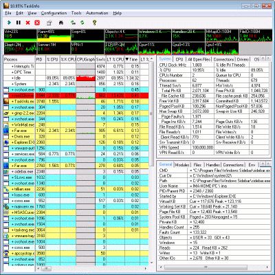 TaskInfo for Win9x/ ME/ NT/ 2k/ XP/ Vista is a combination of Task Manager and System Information. Show most of the processes that are often invisible such as keyloggers and so on. Provides real time info on all processes and threads including System threads. Shows TCP/IP Connections. For each process, it shows CPU usage, scheduling, path, open files, memory, DLLs, command line, environment variables, and more. Run and force termination of processes. Reboot, Restart, Shutdown System. It also shows System wide info: CPU, Memory, Cache usage, Data rates for Disk, Network, DialUp IO, VPN IO, IP Address, and more. Various Low Resources Alerts available. |