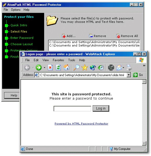 select file(s) to protect, enter password, choose logon page style and
