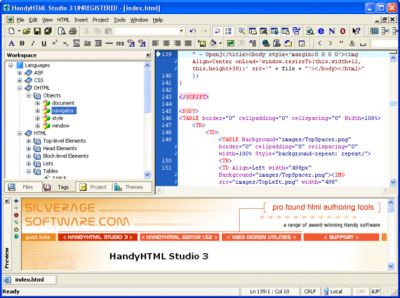HandyHTML Studio is a powerful integrated web development environment that supports HTML / CSS / JavaScript / ASP / PHP / PERL / JAVA / XML and C++ as development languages. The application offers an extensive set of features to make the web developer's life easier, allowing creation and effective management of all kinds of web projects from simple pages to titanic web sites. HandyHTML Studio is intended both for professional web developers and newbie webmasters who have already realized the disadvantages of visual web development. HandyHTML Studio brings hand coding to the new level of ease and confidence, allowing syntax highlighting for all web development languages available today as well as project-based website management, built-in ftp upload tools, customizable templates, and even keyboard-bound code fragments. HandyHTML Studio comes with a remarkably easy-to-use interface available in English and French to make hand coding of web sites even easier than WYSIWYG editing. |