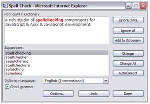 Spell Checker Dialog JavaScriptSpellCheck allows you to call Microsoft Word style spell-checking on any form field, string, HTML Element or iFrame. The spell checker dialog supports custom user dictionaries , grammar and over 10 international languages.