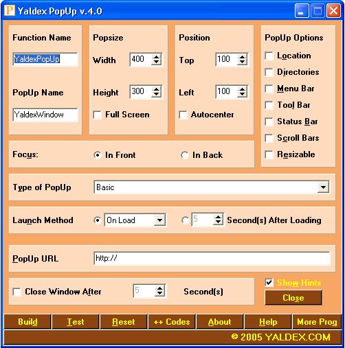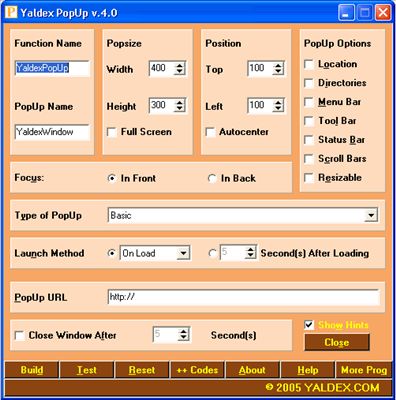 This WYSIWYG program creates JavaScript and HTML code to open an URL in a new (PopUp) window. You can specify the properties of the new window (whether it is resizable, has a menu bar, a so on). For example, you can use it to open a larger image in a separate window when the visitor clicks a thumbnail image. You can make the new window with exact size of the image. If you specify no attributes for the window, it opens at the size and with the attributes of the window that opened it. Specifying any attribute for the window automatically turns off all other attributes that are not explicitly turned on. For example, if you set no attributes for the window, it might open at 640 x 480 pixels and have a navigation bar, location toolbar, status bar, and menu bar. If you explicitly set the width to 640 and the height to 480 and set no other attributes, the window opens at 640 x 480 pixels and has no navigation bar, no location toolbar, no status bar, no menu bar, no resize handles, and no scroll bars. This version includes mini html editor with full html and JavaScript highlighting. Yaldex PopUp is the most powerful application for creation popup windows, includes dozens adjusted tools and additional scripts. |
