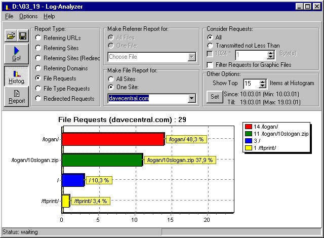 10-Strike Log-Analyzer processes raw log files (NCSA common and extended formats) which are created by web-servers (such as Apache, etc) and generates many types of reports and histograms (such as referrers, files requested, redirected requests and other). You can easily determine the most popular files and referrers and build reports for every file requested. There are many options and filters that can help you get exact information about your site. The program has a friendly and easy to use interface, so you can start working immediately after installation without a huge learning curve. Reports supported: referring URLs, referring sites, redirected referring sites, referring domains, file requests, file type requests, redirected file requests, visitors' countries, visitors' IP-addresses. |