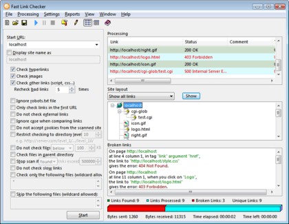 Fast Link Checker is used to find broken links on web sites. It works like a search engine bot (Googlebot, MSNBot, WISENutbot, Alexa, etc.). You specify the starting file and Fast Link Checker goes through all pages this file has links to until it checks all links on the site. If Fast Link Checker finds a broken link, it shows its position in the document, the reason why it does not work and a hint how the link can be fixed. Fast Link Checker has a flexible management system and can check links to documents, images, scripts and other files. You can check links either only on one page or restrict the level of subdirectories it checks. Fast Link Checker can check links in files available via the HTTP, HTTPS, FTP or FILE protocols and ignores all Gopher, Chrome, News and "mailto:" links. It supports HTTP, HTTPS and SOCKS proxy servers. Fast Link Checker allows you to generate and save reports. Fast Link Checker allows you to generate and save reports. It implements a multi-threaded algorithm allowing it to download and check several pages at a time, which considerably improves the performance. |