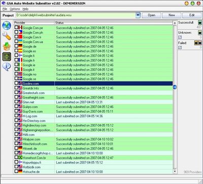 The GSA Auto Website Submitter is a program designed to submit your website to hundreds of search engines and directories. It will save you a lot of time and money since its fully automated. Promoting your web page has never been easier. You just enter some information about your web site and the program does the rest. The program is getting updated several times a month to make sure all included providers (over 2600 and growing) still work. There are a lot of web sites, search engines and directories. This program will make sure that your web site will be found by much more people. But why is it so important to have your web site listed on so many other sites? Not only that more customers will find and use your services, but also your ranking in the search engines will dramatically rise. It is very important to have as many links to your web page as possible to get a good ranking in search engines. That's what this program is taking care of. |